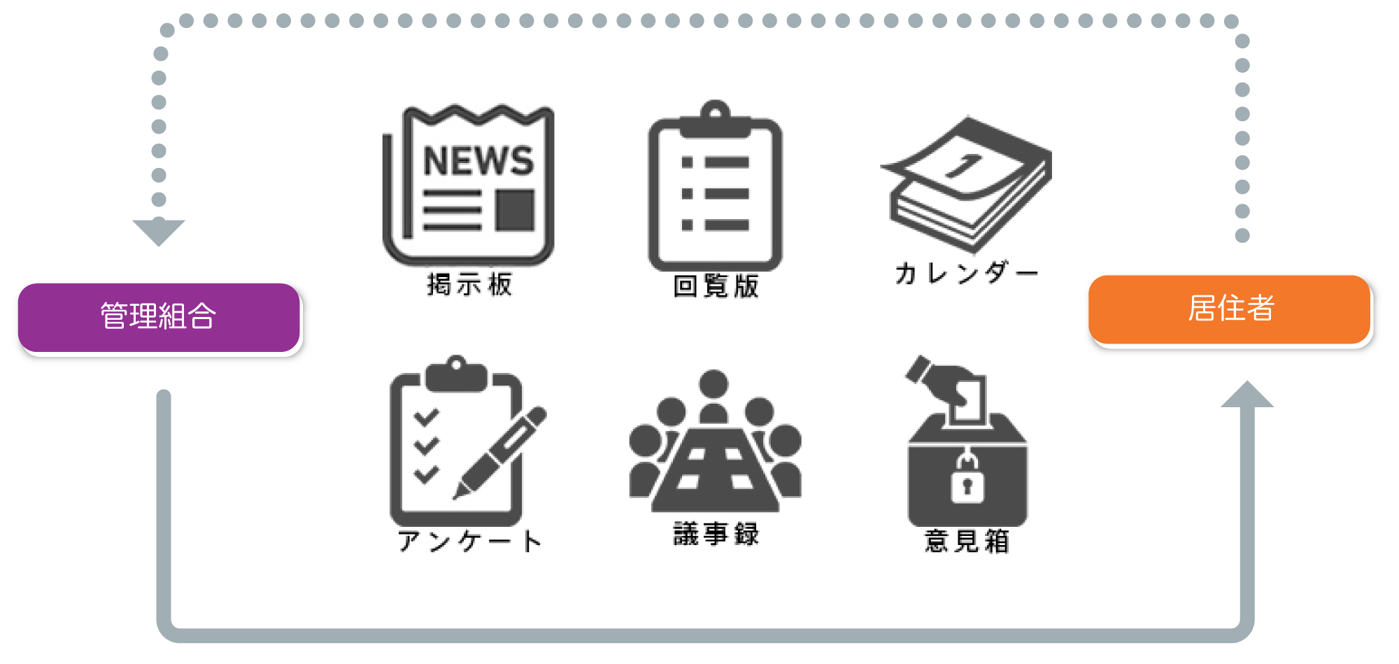 従来はチラシや回覧板、またはホールの掲示板で告知していた理事会や、管理会社からのお知らせ、